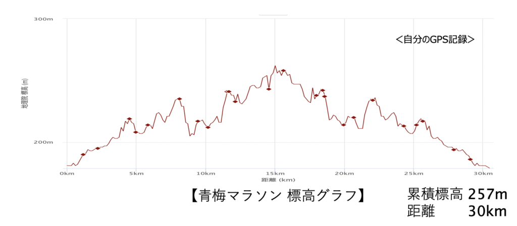 GPSログを確認すると、累積標高は257m。身体へのダメージは蓄積され、特に21km過ぎに立ちはだかる長い登り坂と、25km付近にある「最後の登りらしい登り」は、達成感を味わうためには欠かせない難所です。