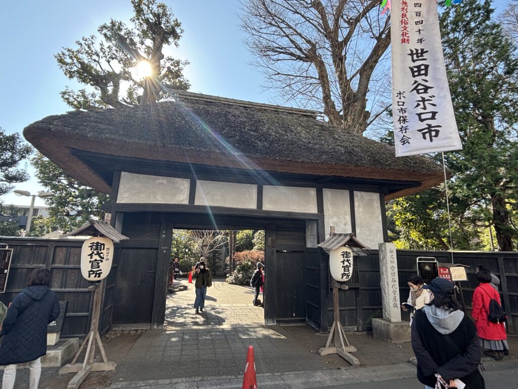 茅葺き屋根の重厚な門に「世田谷ボロ市」の大きな垂れ幕。ここを通ると、一気にタイムスリップしたような気分になります。歴史の深さを感じますね。