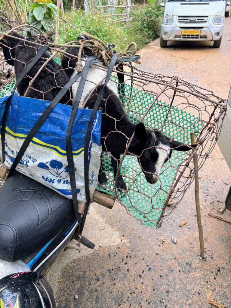 ヤギも豚もカゴに入れられてバイクの荷台に乗せられて運ばれてくる。