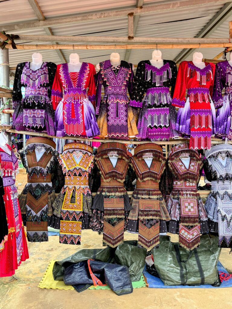 ハレの日に着る花モン族の民族衣装の陳列スペースが多くあった。この衣装を着て、結婚式などに出席する。
