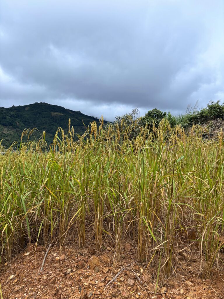 水田の稲刈りはどこも終わっていたが、わずかながらも陸稲栽培の稲は収穫前だった。陸稲のお米の方が香りが良く、ラオスでこれを蒸したご飯が美味しかったのを思い出した。