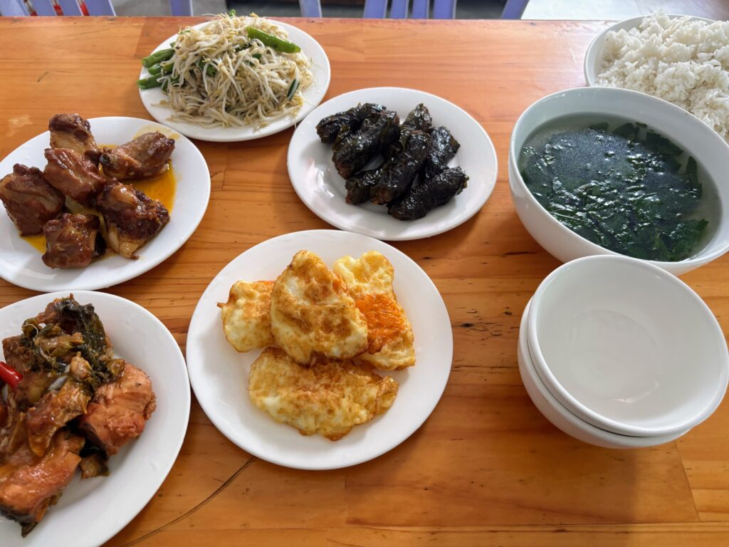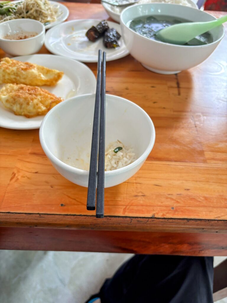 ベトナムの食事の時をマナーを教えてもらう。お茶碗に箸をまっすぐ立てて置いていると食事中の意味。日本のように横に置くと、食事終了の意味。ご飯をよそう時は、2回と決まっている。3回以上もダメ。他の人におかずを取ってあげるときには、箸の反対側と使う。自分に取る時は食べる側を使って良いとのルール。ナプキンなどゴミはゴミ箱に入れないけれど、食事のマナーは、色々と厳格にあるようだ。