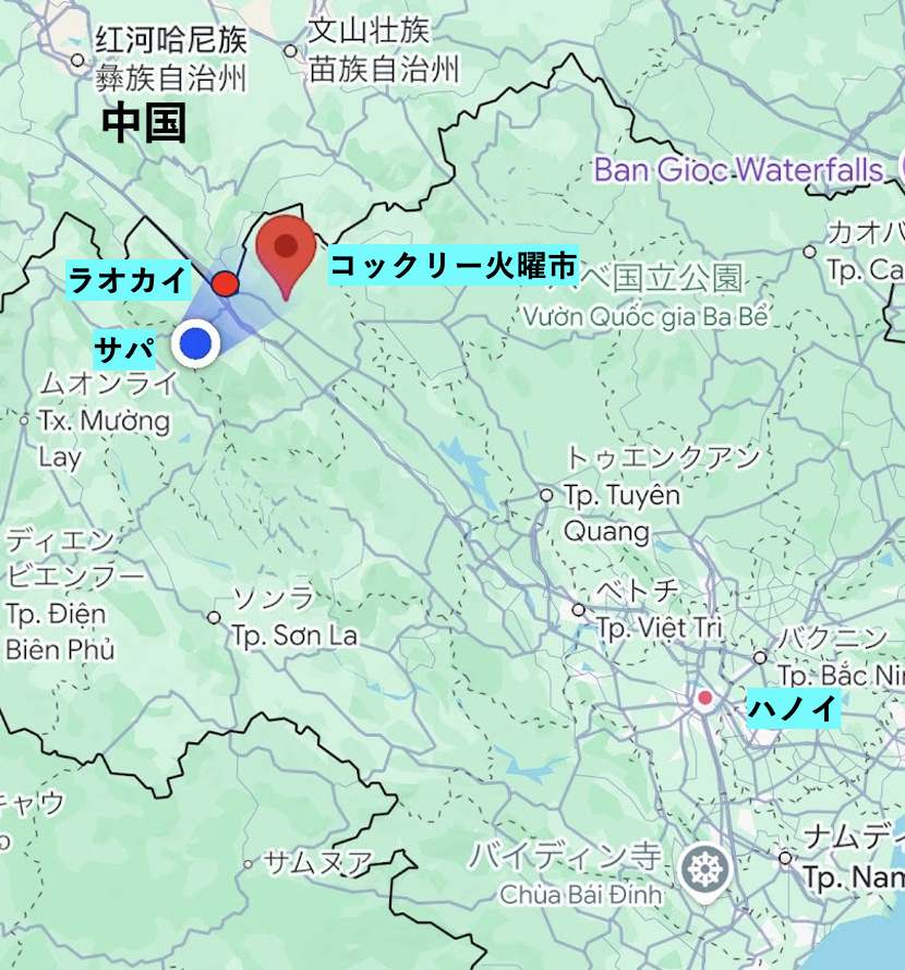 サパからコックリーまで84km。サパから中国との国境の町であるラオカイを通って、2時間15分ほどかかる。ラオカイ〜ハノイは高速道路があるが、サパからコックリーまでは一般道路で行く。