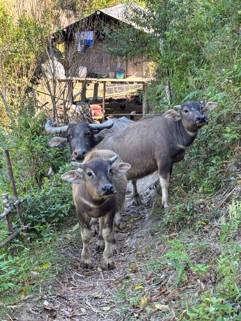 トレッキングといっても、基本的に村の生活道を歩く。水牛が歩いていたりする。水牛は基本的に温厚だが、刺激しないように注意する必要がある。あの角に突進してこられたら大変なことになる。