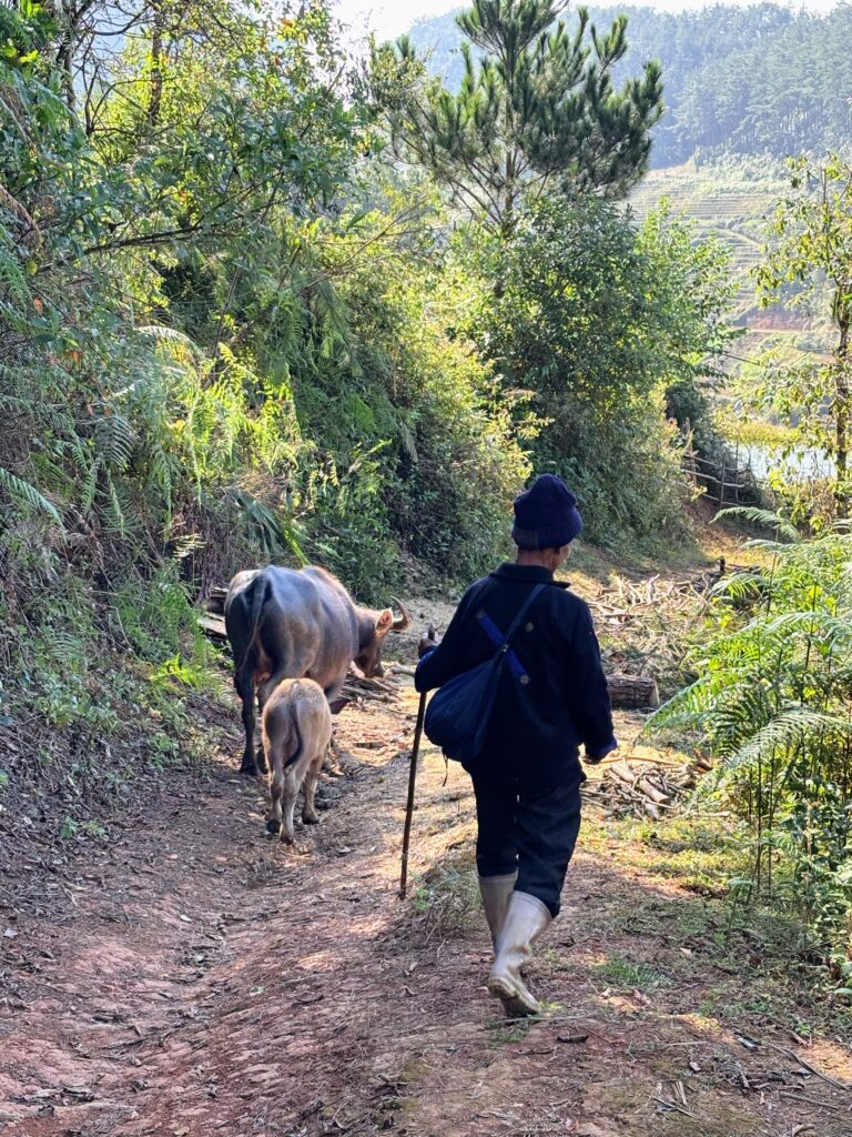 おじいさんが、水牛を連れて、田んぼの方に向かっていた。