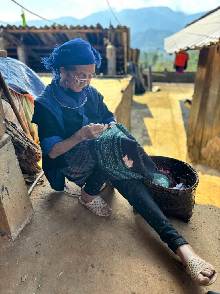 3時間ほど歩いて、初めて座っての休憩。モン族の家に立ち寄った。庭先でおばあさんが刺繍をしていた。ガイドのスワさんとは顔馴染みで、モン語でやり取りをしている。モン族の女性は、赤や緑のカラフルな布を頭に巻いているのが普通。ただし、70歳以上になると青色の布を巻いているのが普通だと教えてもらった。服装も青色をベースとした民族衣装で落ち着いた感じ。