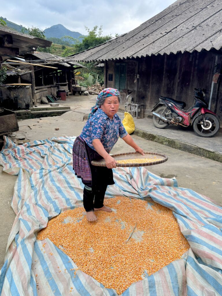 庭先では、収穫して干したとうもろこしの選別作業をしていた。