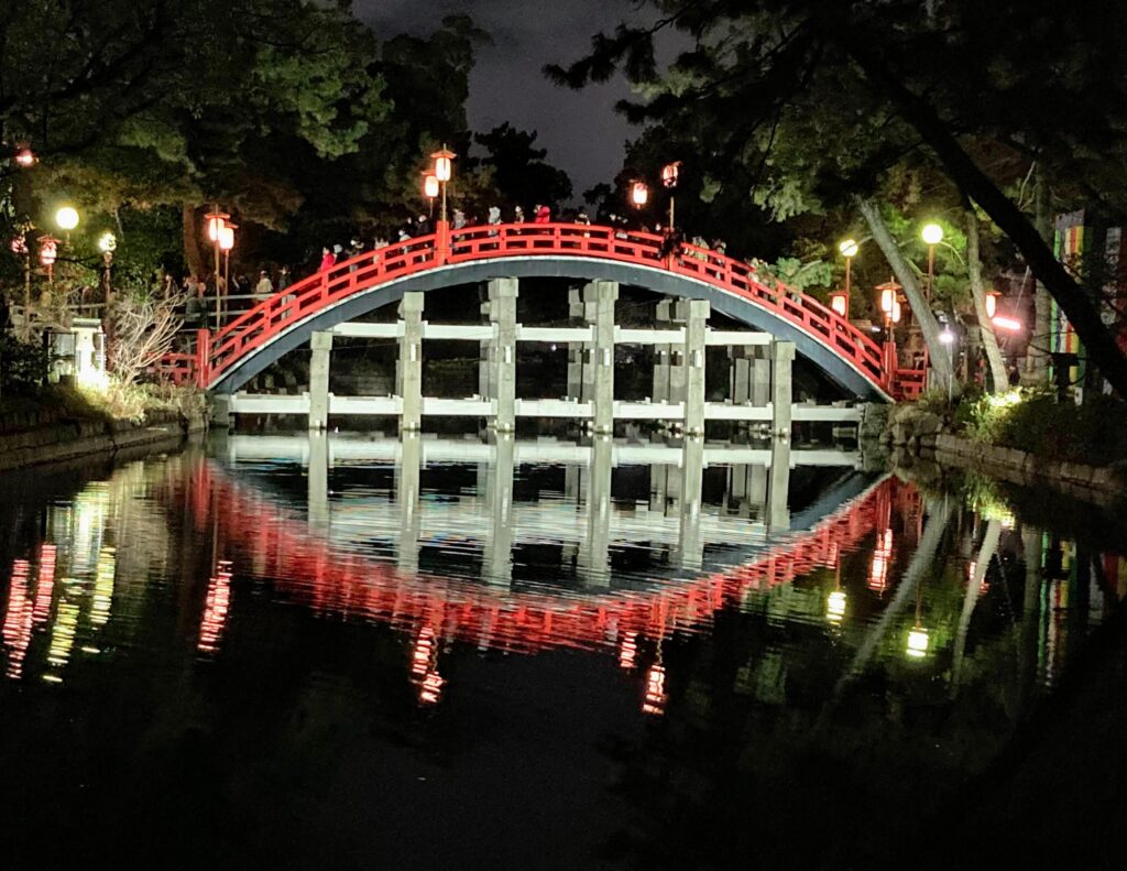- この橋を渡るだけで「お祓い」になると言われており、夜間はライトアップされ、水面に映る姿が非常に幻想的です。
