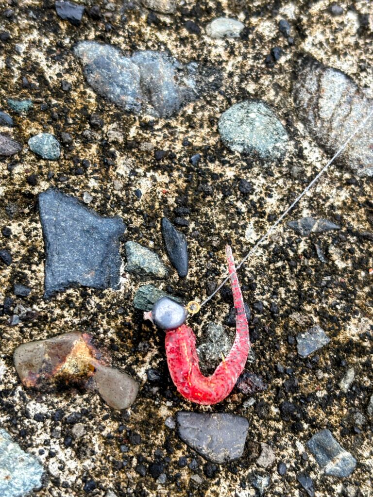 針の先にアームの擬似餌をつけて、リールで投げてみたが、全く反応なし。渓流釣りと違って、魚が追ってくることも見えないし、単調な作業だった。また、小魚を見ても、逃げる様子もないので、渓流釣りに比べて大雑把に感じた。改めて、渓流釣りとは繊細なものだと思った。
