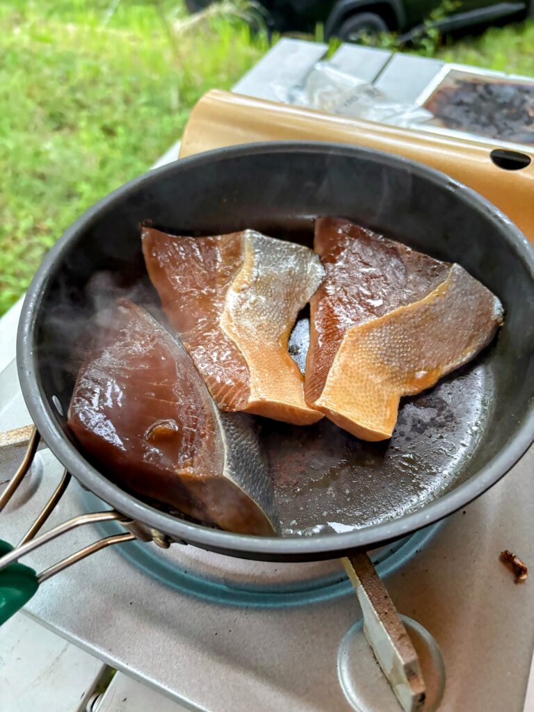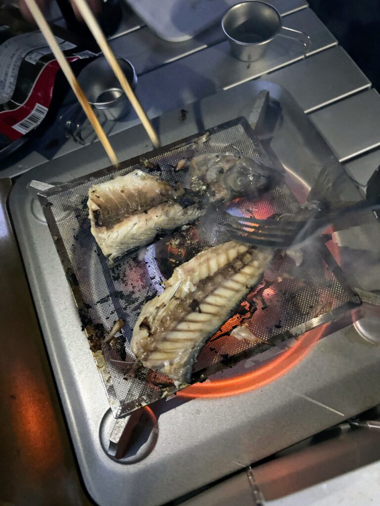 キャンプ場の方からサービスの鯖の干物をもらったので、焼いて食べる。夕方になるとキャンプ場の方が、配ってくれる。