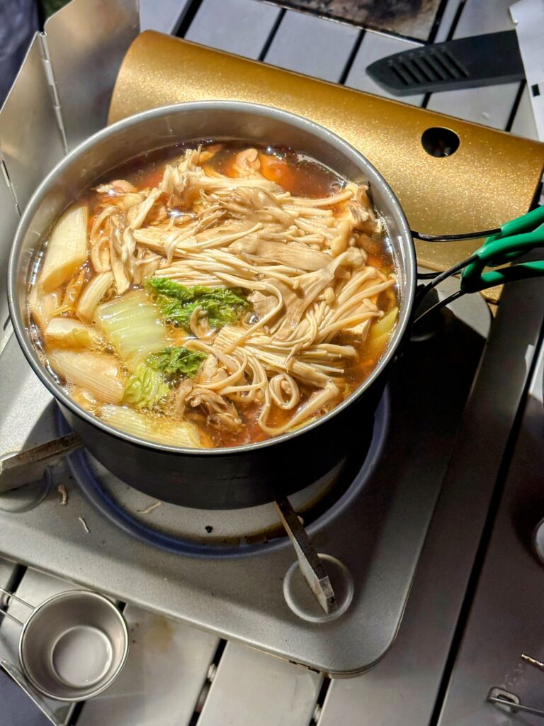 メインはとり鍋とした。寒い屋外での鍋は体が温まって良い。