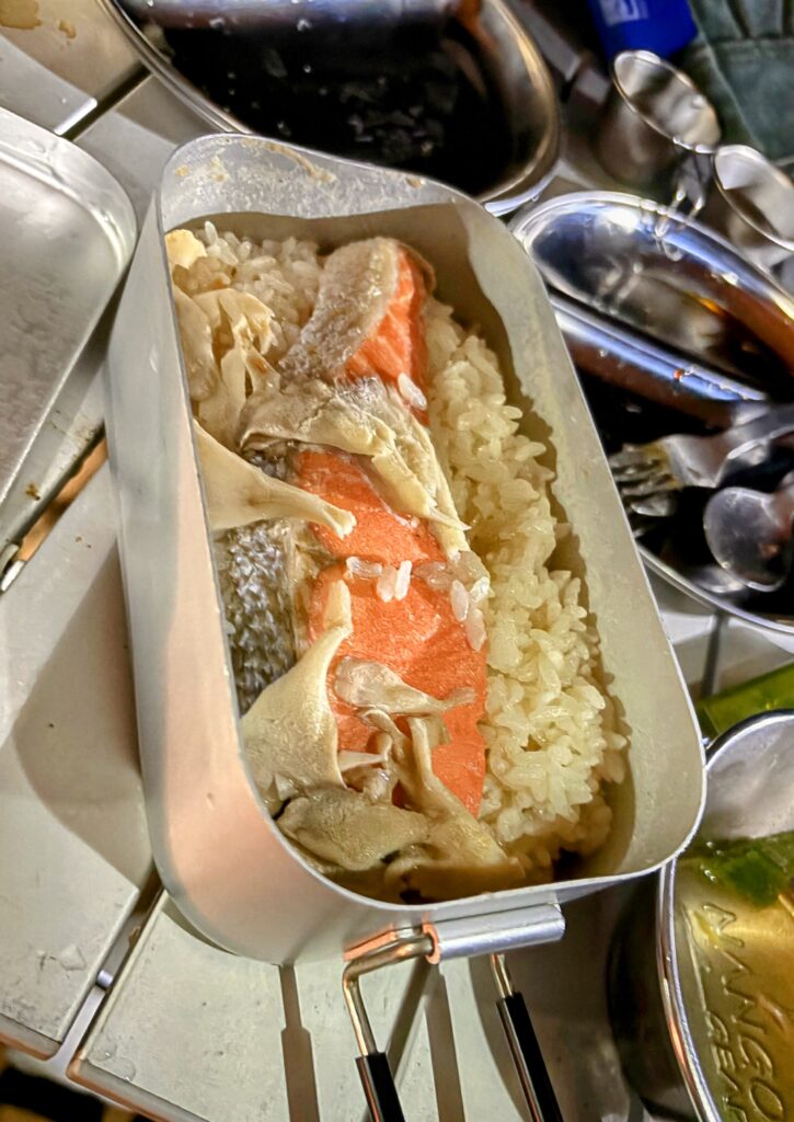 ご飯も食べたくなって、メスティンで鮭ご飯を炊いた。鍋に入れる舞茸を入れて、炊き込みご飯にする。