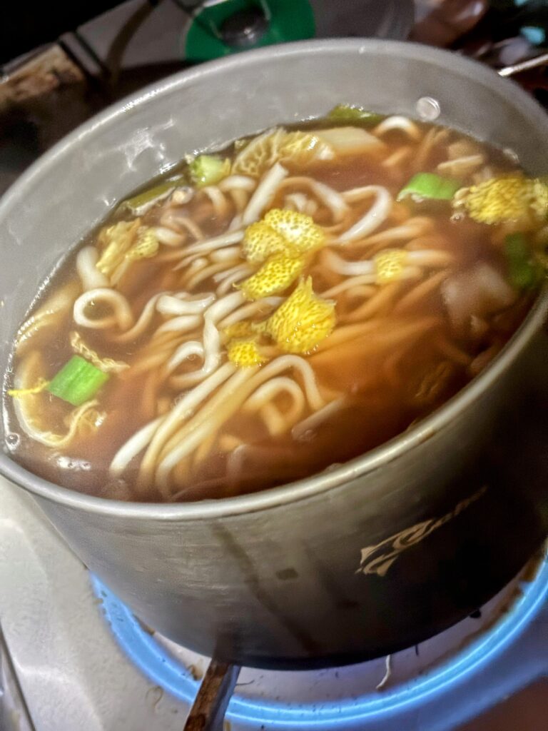 〆は、キャンプ場で売っていた柚子をたくさん入れたうどん。柚子の香りがたまらない。