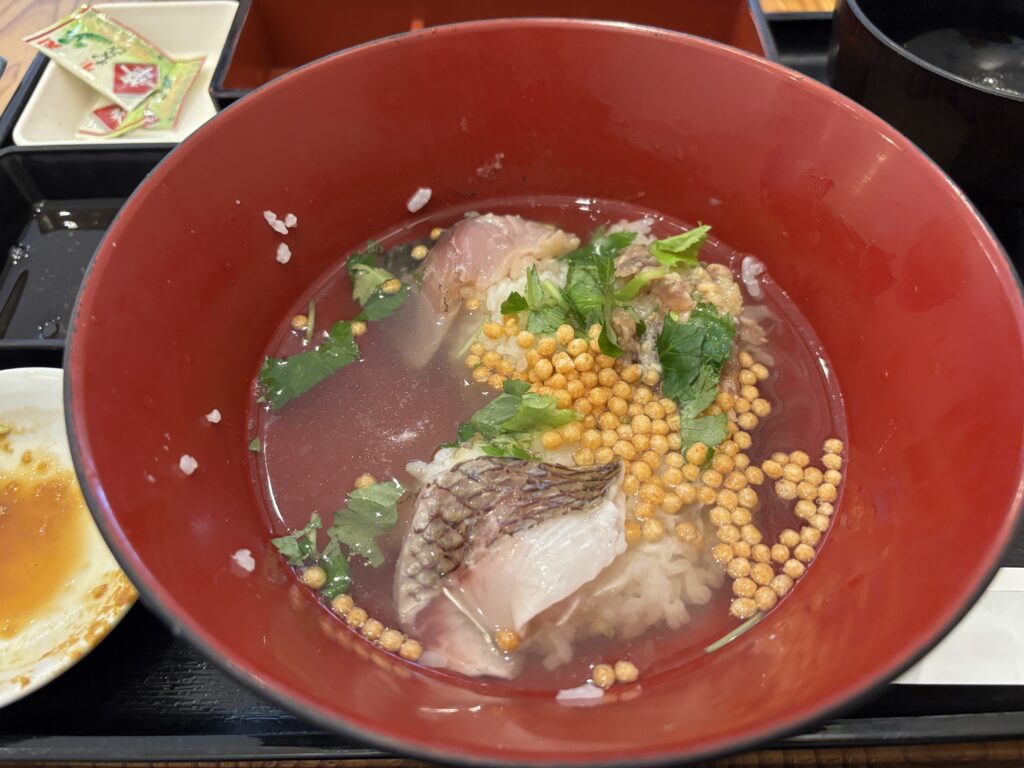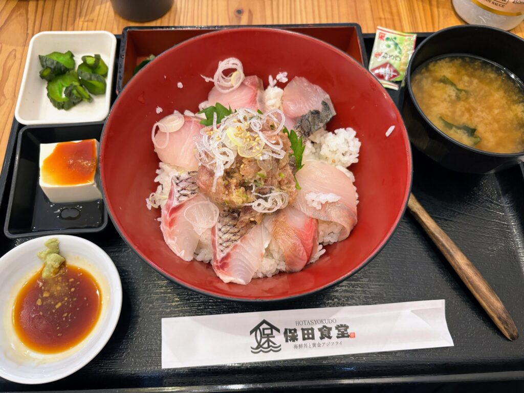 「海鮮丼と黄金アジフライ 保田食堂」で、「地魚刺となめろうのぶっかけ丼」を頂いた。4種の地魚となめろうが入った海鮮丼。お出しも付いてきて、3分の1くらいになったらお茶漬けにできる。
