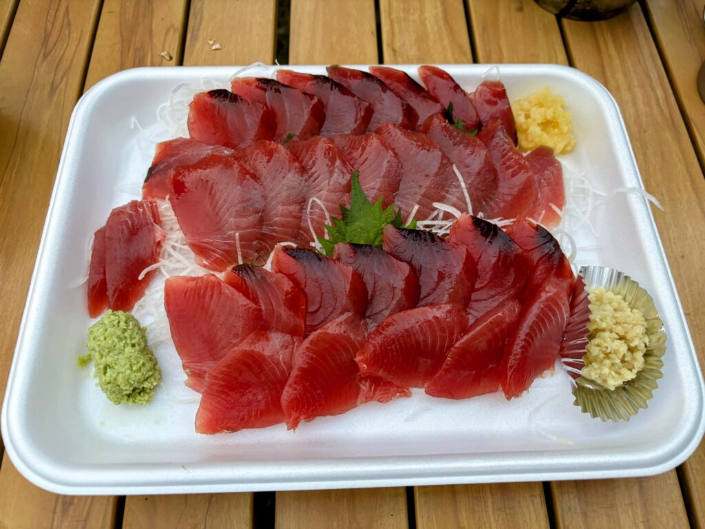 昨年も訪問しており、大きな目的の一つは千倉にある「新吾鮮魚店」で購入するお刺身。下の写真は、昨年食べたカツオのお刺身セット。わさび、生姜、ニンニクをちゃんと付けてくれた。美味しすぎて、これが目的で今年も千倉に来たくらいだ。これで1000円くらいだった記憶がある。