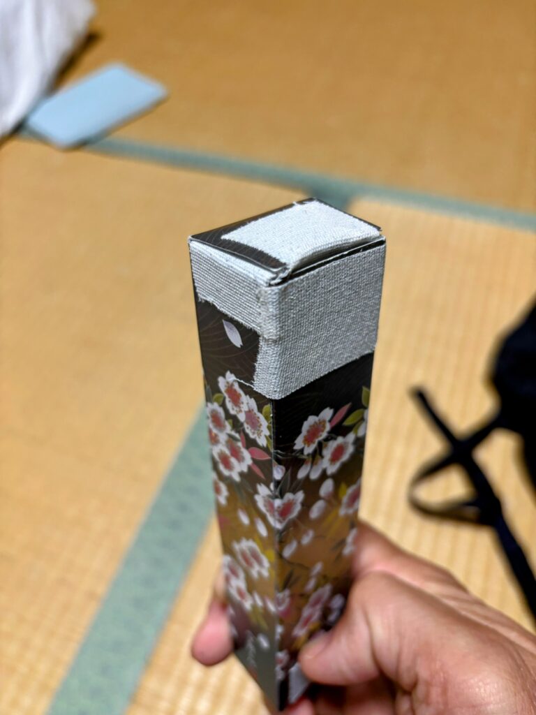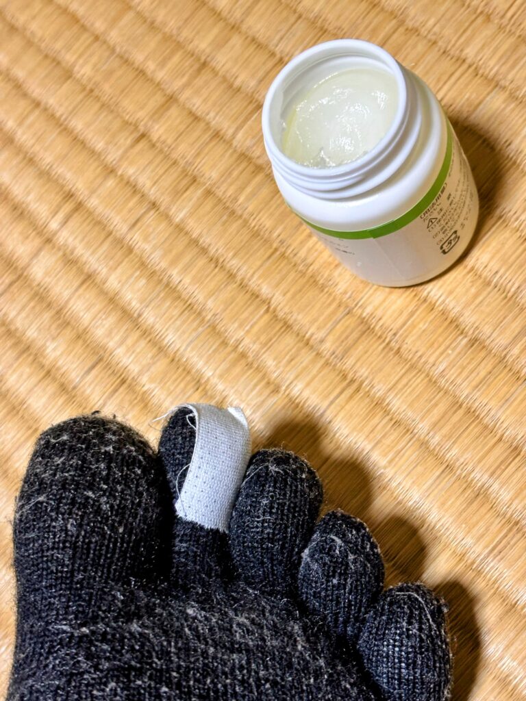 朝の儀式、テーピング。当然、足に貼る。靴下に穴が空いたので、靴下にも貼る。お線香を入れる箱も潰れてきたので、箱にも貼る。なんでも役に立つテーピングだ。それにしても、モンベルの靴下がたった7日間で穴が開くとは…。