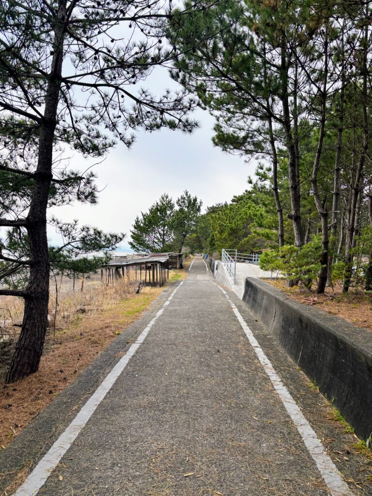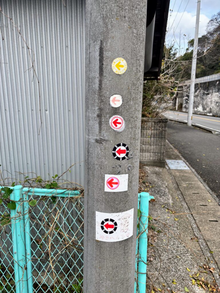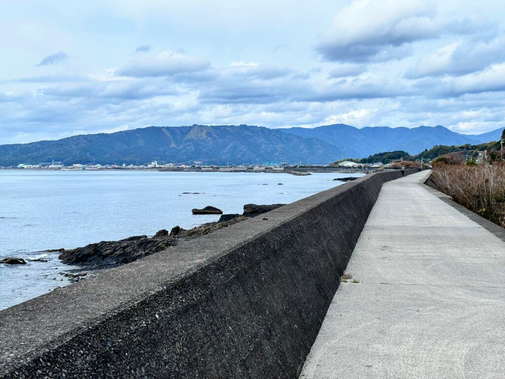 その先、お遍路シールがいっぱい貼られていて先輩方の力強い意志を感じるポイントで曲がる。ラブホテル(歩き遍路用の宿ではない)の脇を抜けて海岸に出ると、そこからは快適な堤防の上を歩いて行く。