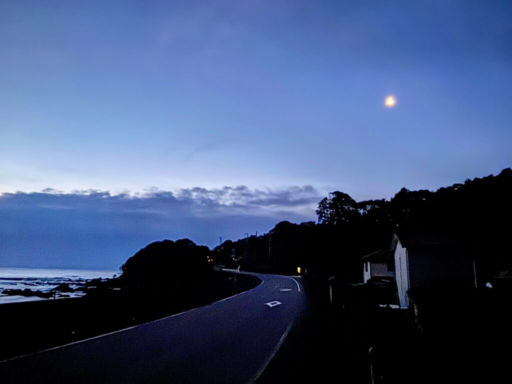 朝6時前に歩き始める。室戸岬を歩いていた時は満月だった月が、足摺岬に向かう今朝は三日月になっていた。月の満ち欠けに、旅の長さと時間の経過を強く感じた。