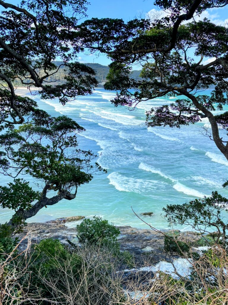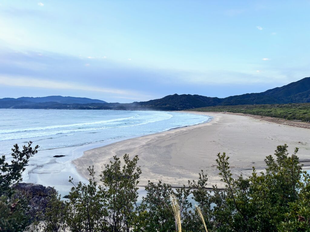 大岐の浜では、木の橋を渡ってしばらく砂浜を歩くこともできるが、行きは常緑広葉樹の樹林帯の中を歩くルートを選択した。波が立ち、朝焼けの中に月が見える、とても美しい景色だった。