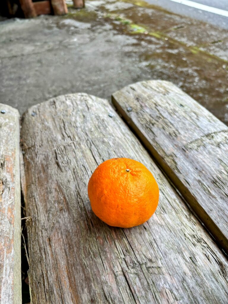 道中、車がスッと止まり、お接待としてみかんをいただいた。「頑張ってください」という言葉が心に沁みる。その後、立派なへんろ小屋で休憩し、いただいたみかんを食べた。めちゃくちゃ甘くて美味しかった。