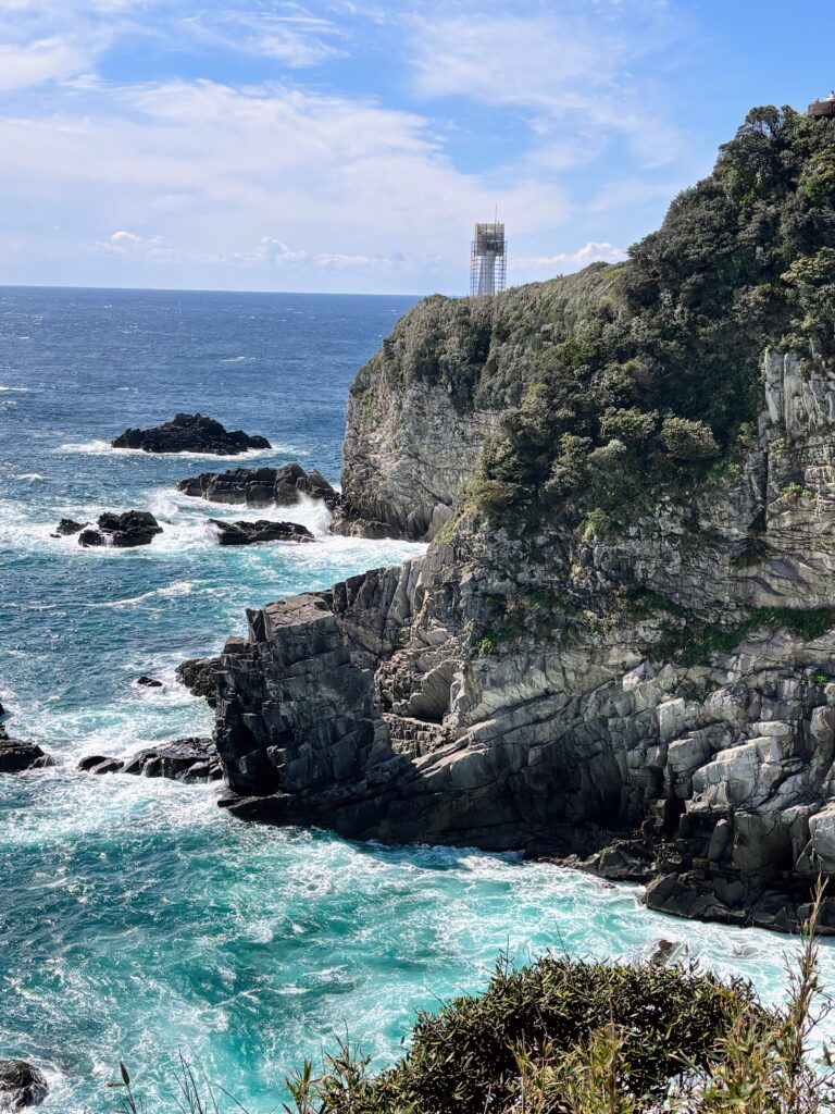 その後「天狗の鼻」にも立ち寄る。ここは「21世紀に残したい日本の風景」に選ばれた絶景ポイントだ。足摺岬の灯台が美しく見える場所だが、残念ながら灯台は少し改修中だった。足摺岬の波は荒々しくて、風がとても強い。