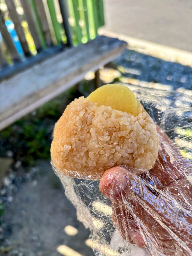 途中、へんろ小屋で宿の女将さんが作ってくれた大きなおにぎりを食べ、エネルギーを補給した。沢庵が2枚刺さっていた。もうひとつのおにぎりには、梅干しが刺さっていた。新しいスタイルのおにぎり。とても良い。