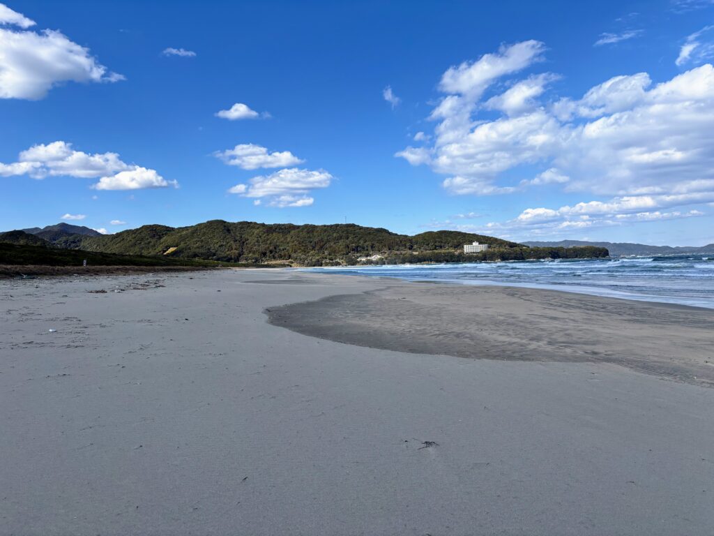 そして、ふと反対側を振り向くと、今まで歩いてきた長い海岸線が遠くの遠くまで見渡すことができた。「こんなに歩いてきたんだな」という実感と同時に、今日は打ち戻りルート。「これを歩いて帰らなきゃいけない」という現実が目の前に突きつけられた。