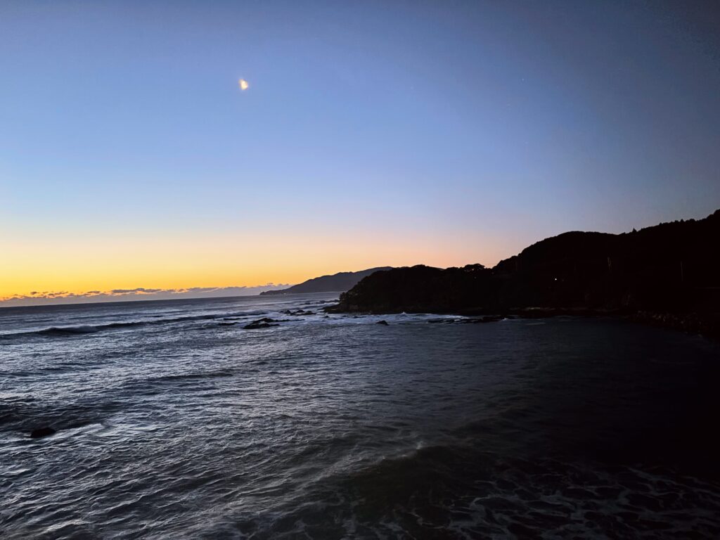 「今日は朝焼けが綺麗よ」と女将さんに見送られて宿を出発。目の前には、言葉通り本当に美しい朝焼けが広がっていた。