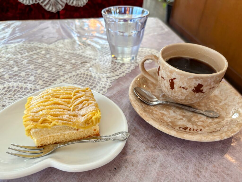 最後の7kmはコーラを飲んで凌ごうとしたが、暑さに負けてドライブインのようなカフェにピットインした。35km歩いたご褒美として、モンブランとコーヒーを注文。店内はすべてが昭和の匂いが漂うレトロな空間だった。お昼ご飯のおにぎり2個ではエネルギーが足りなかったようで、甘いケーキを食べたら一気に元気が回復した。