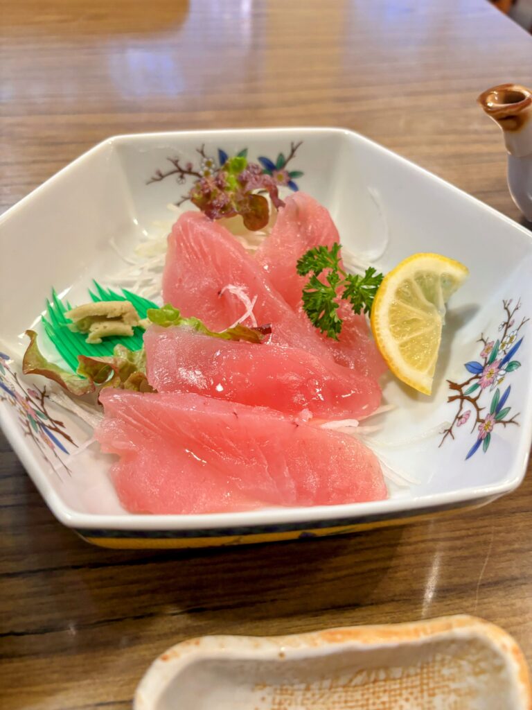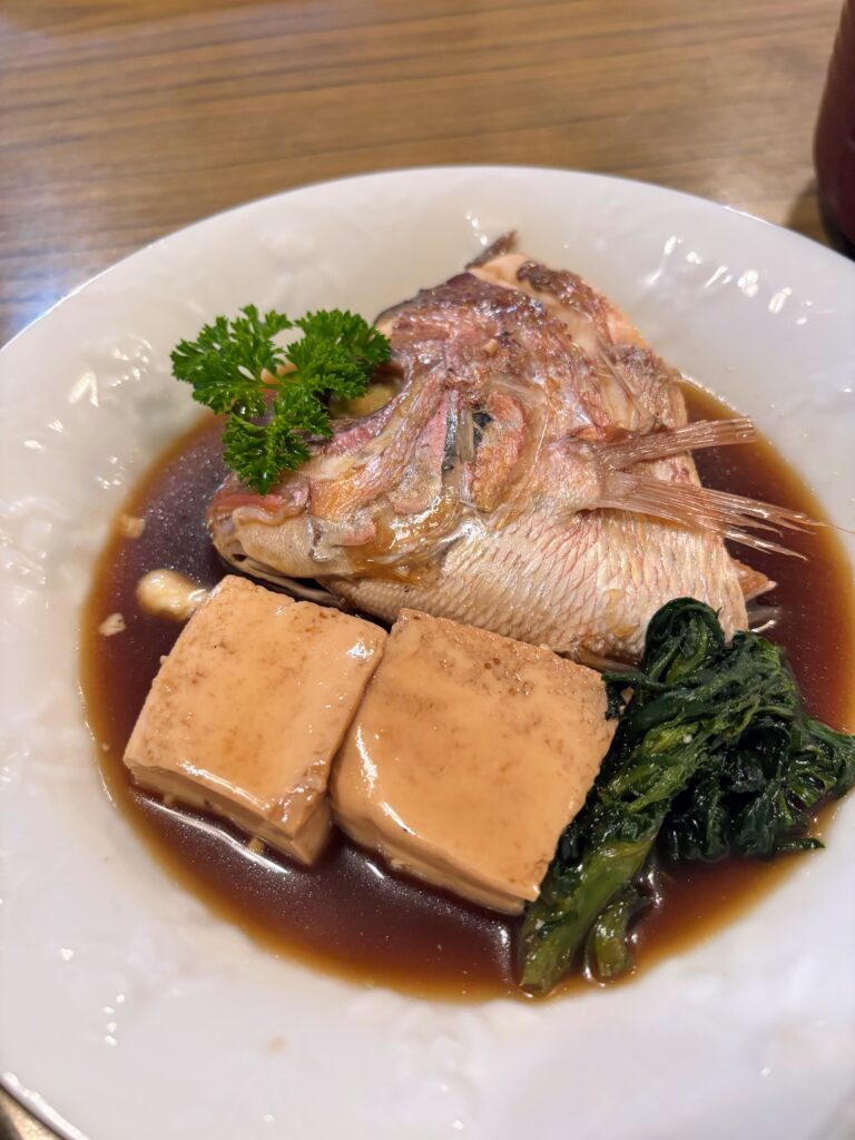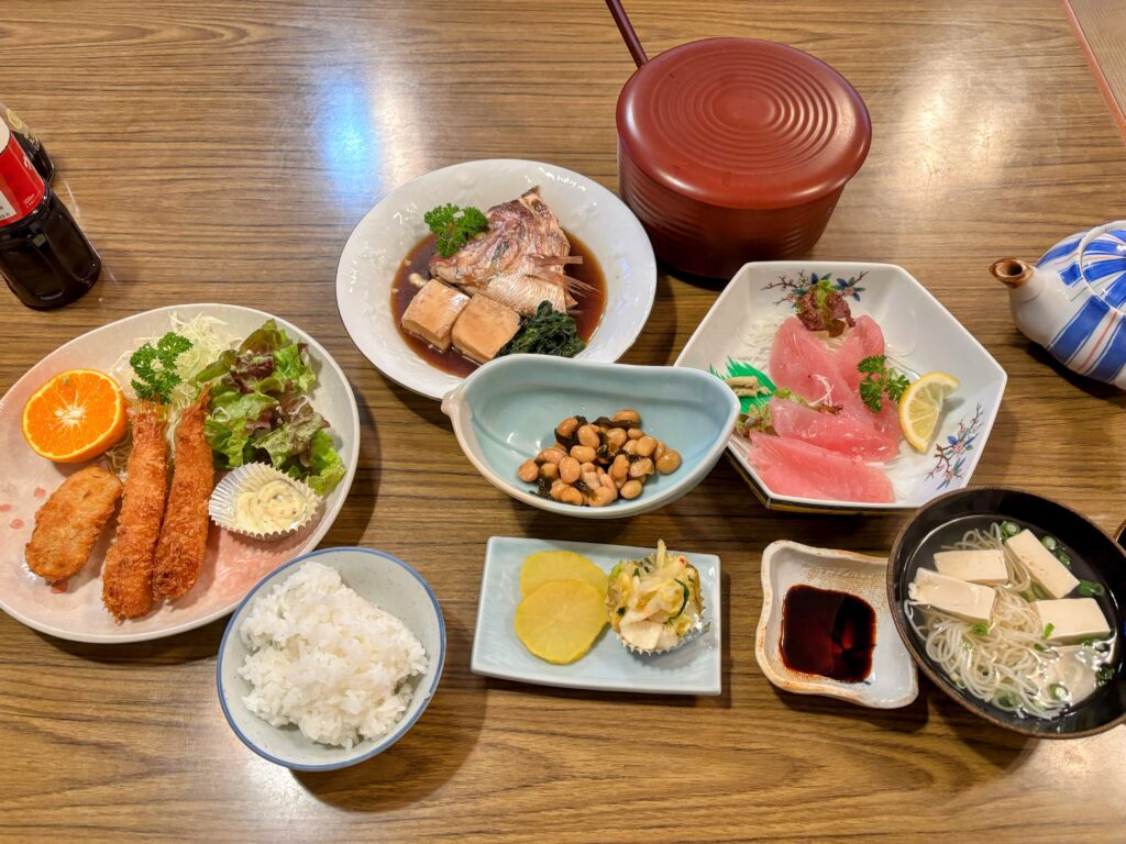 晩御飯は、鯛の煮付け、マグロの刺身、エビフライとボリュームたっぷり。明日への活力になる。