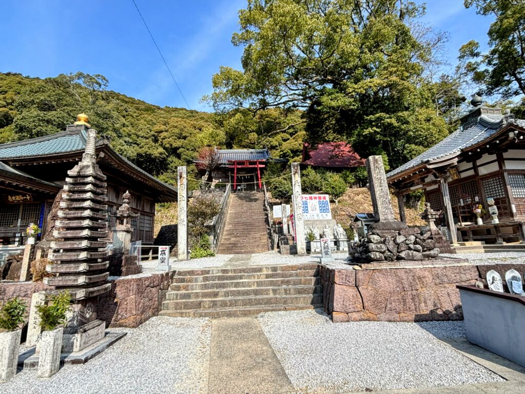 ここは四国霊場で唯一、神仏習合の面影が色濃く残っているお寺だ。山門の代わりに稲荷神社の鳥居があり、それをくぐって境内に入るという非常に珍しい造りになっている。本堂と大師堂の間に、ドドーンと鳥居があるのが特徴的だ。