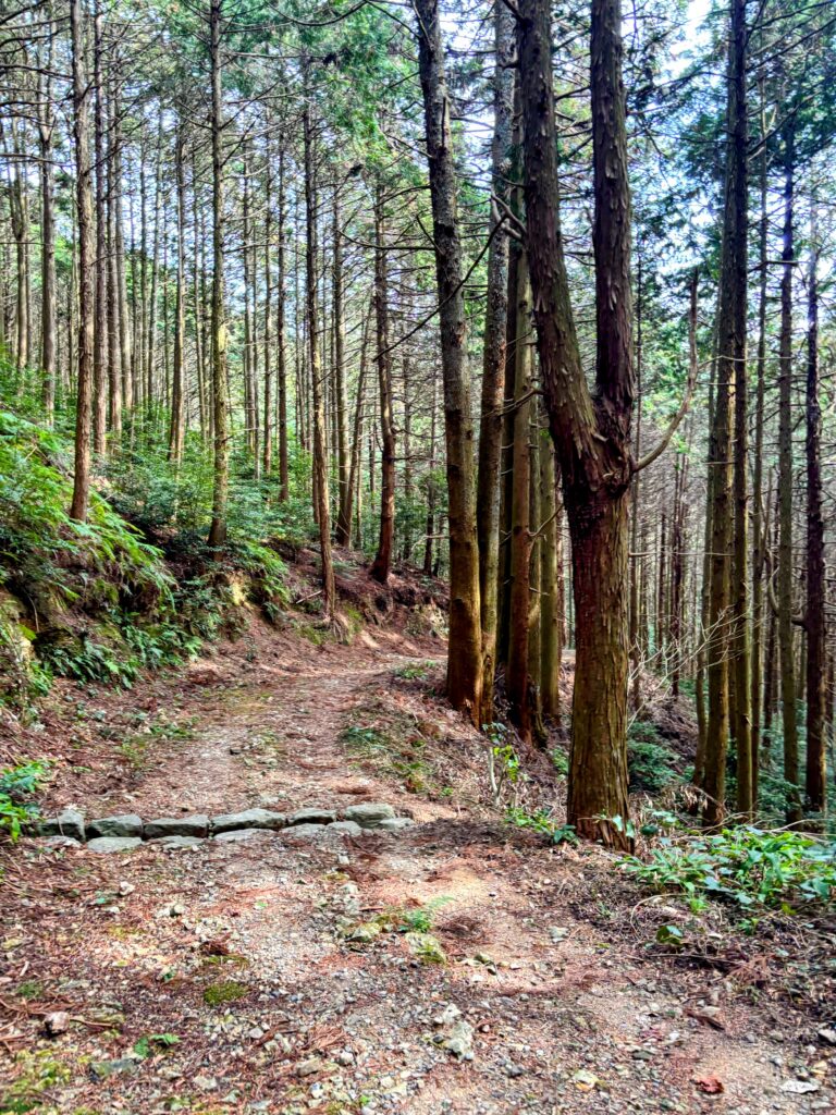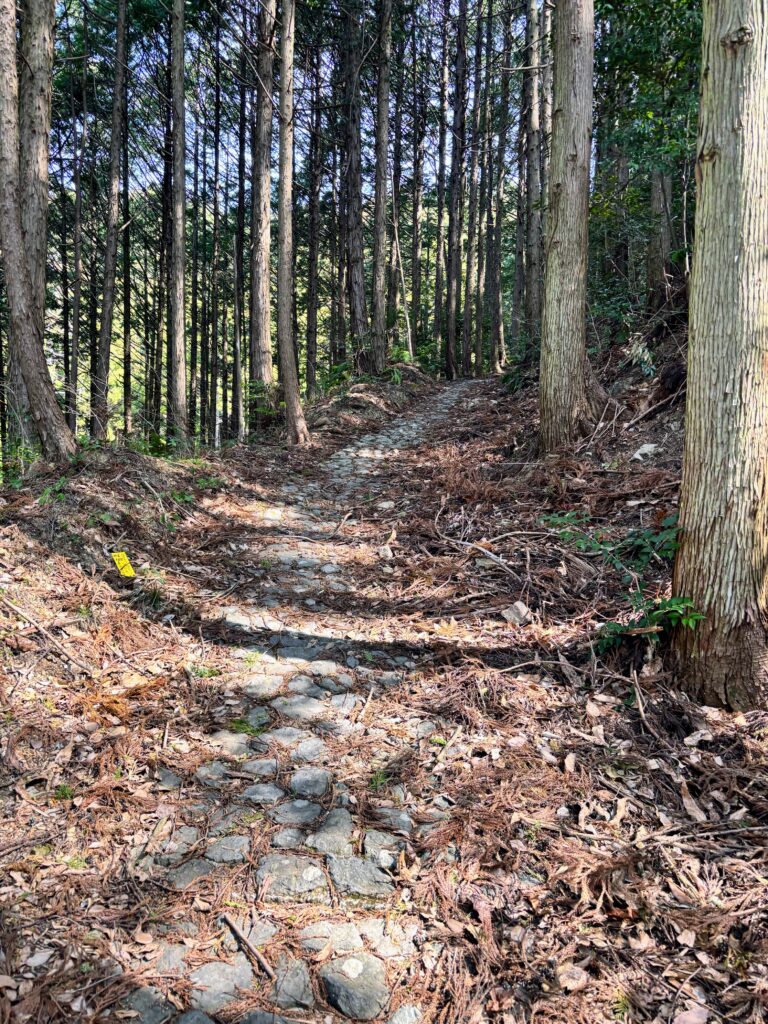一度舗装道路に出て、再びトレイルに入る。そこからは急な坂道を登る。昨日の柏坂よりは距離が短いが、斜度はかなり大きい。途中、海まで見える景色の良い所も通る。