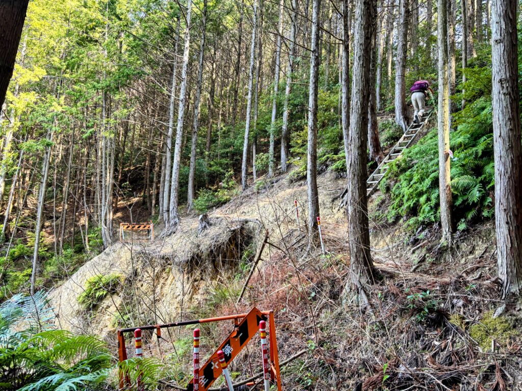 道の崩壊箇所はハシゴで高巻き(迂回して登ること)するようになっている。先行者の方がいて非常に怖がっていた。歩行に注意が必要な箇所である。