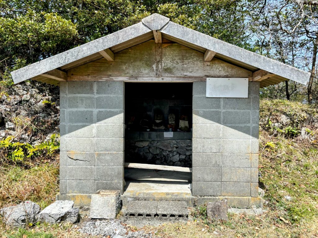 峠のピークは標高約510メートル。お地蔵さんがブロック塀の小屋に入っている。