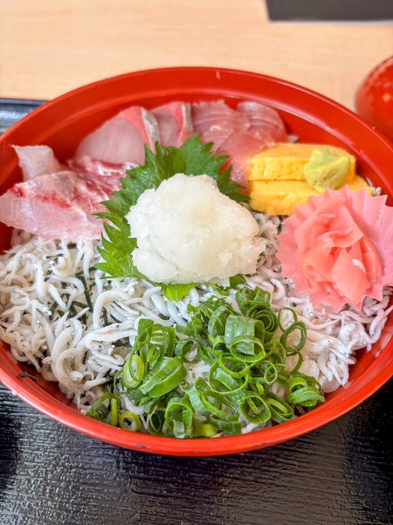 昼食は「道の駅どんぶり館」で、シラスが乗った海鮮丼を食べた。朝からお接待でもらったみかん1個しか食べておらず、すでに5時間以上歩いているので、美味しさが倍増する。iPhoneでアクティブカロリーを見たら1800kcalを消費していた。これならどれだけの量でもペロリと食べられるはずだ。