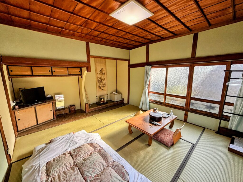 まさに「昭和の旅館」という感じで、廊下といい、部屋といい、たまらなく歴史を感じる。案内された部屋は、太宰治が長逗留して小説を書いていそうな、風情ある旅館の雰囲気そのものであった。感動。