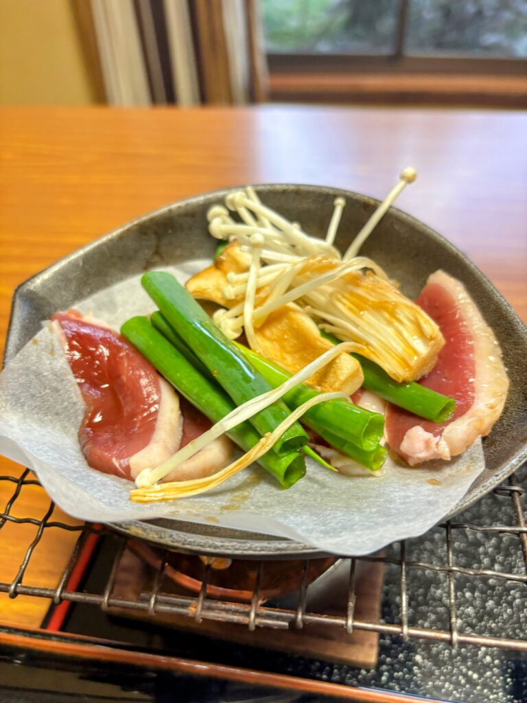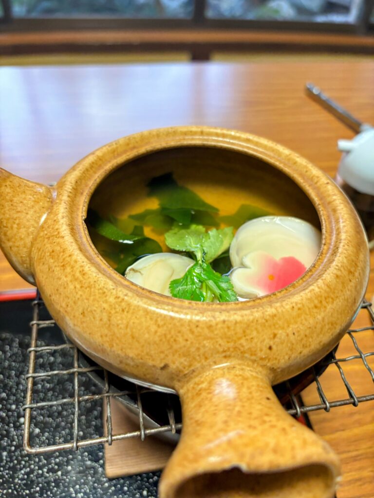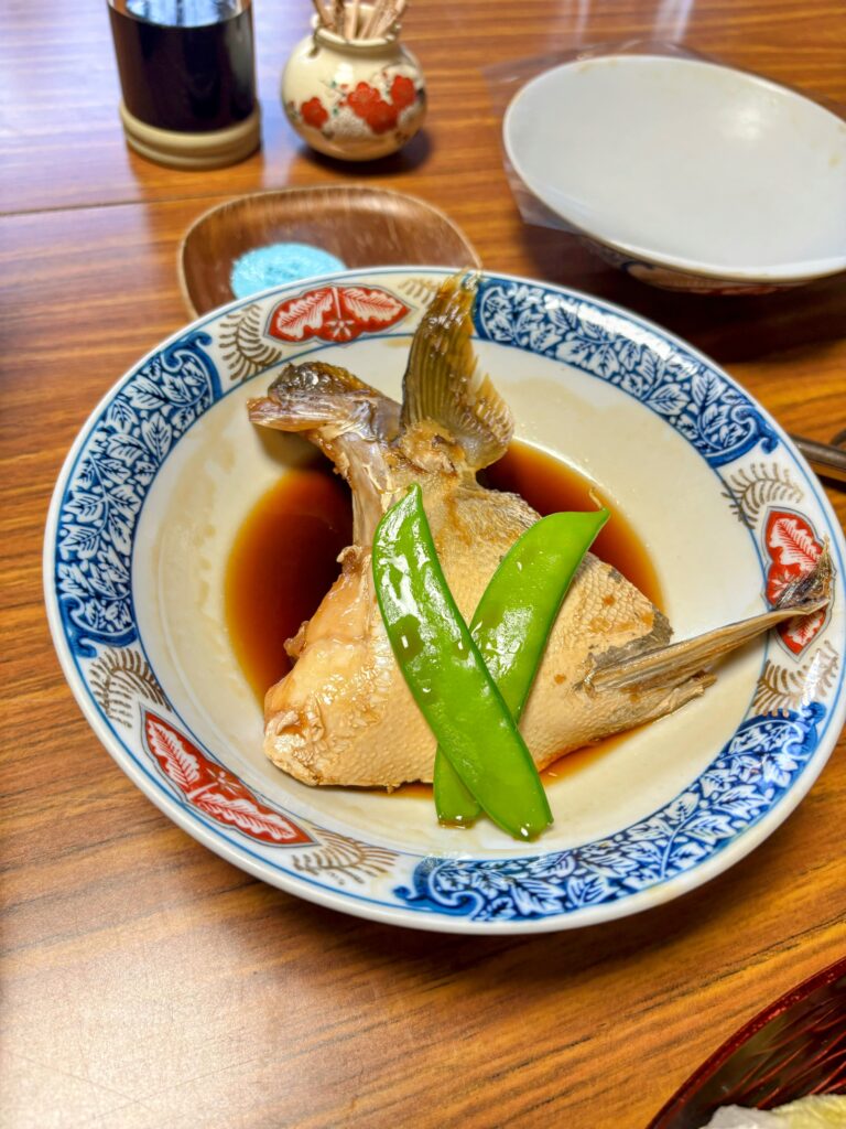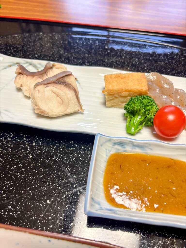 食事も豪華。鴨肉の焼き物、蛤の土瓶蒸し、カンパチのカマの煮付け、お刺身(ブリ、カツオ)、フカ(サメ)の煮たものなど。これで1泊2食付きで8800円。他の歩き遍路宿の水準である。