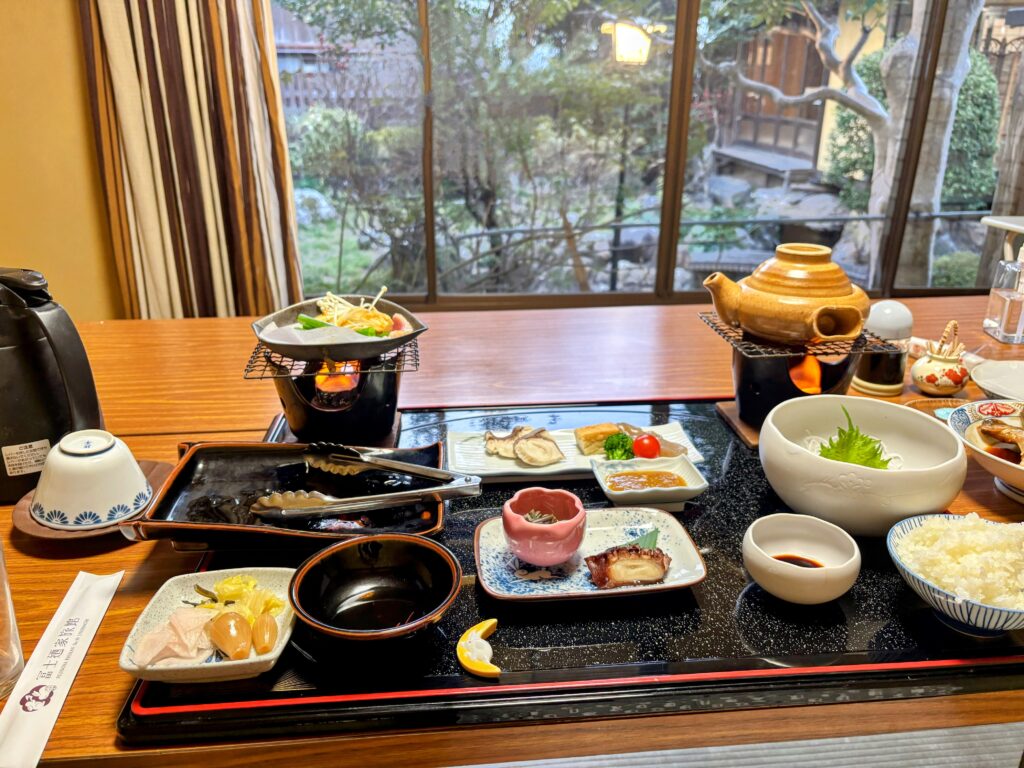 この旅館は宴会も行われるくらい食事が売りのようである。本日も宴会が入っているとのこと。中庭を見ながらの晩御飯で、まるで料亭みたいだ。