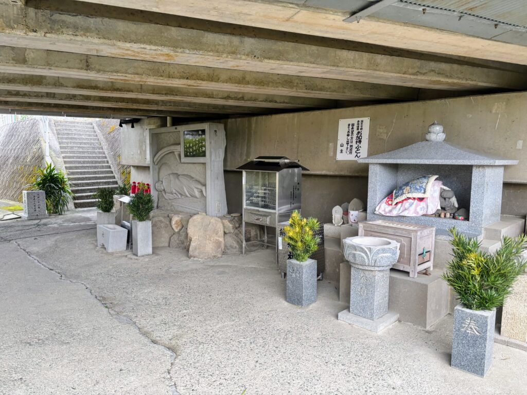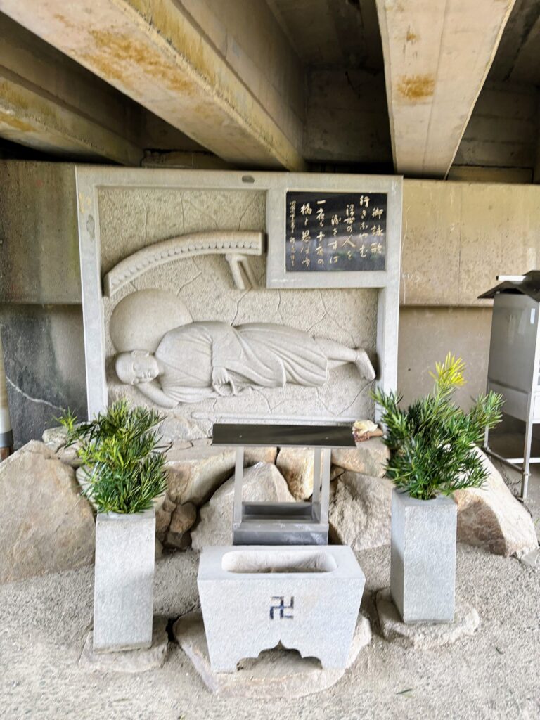 途中、お大師様が野宿されたという橋の下を通った。今日は雨が降っているので、雨宿りにはちょうどいい場所だ。お遍路の心得に「橋の上では杖をついてはいけない(お大師様が橋の下で寝ていらっしゃるかもしれないから)」というルールがあるが、その由来の場所だ。