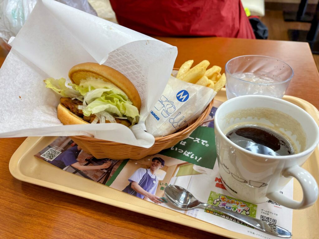 お昼は、インターチェンジ近くのモスバーガーでとった。ここまでほぼ休みなく25kmを歩いてきたので、時間に余裕ができ、ここで大休止とする。