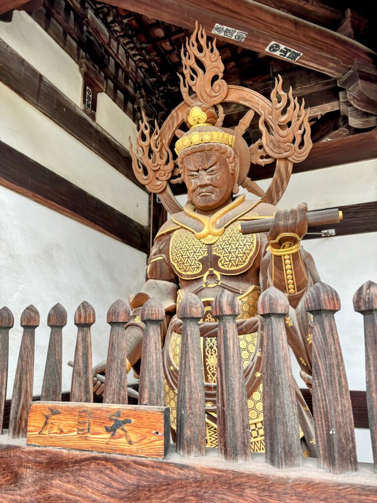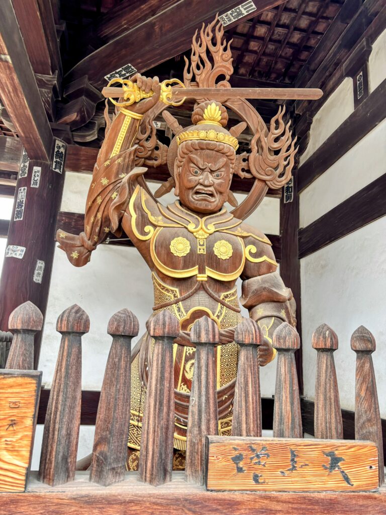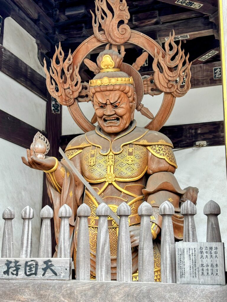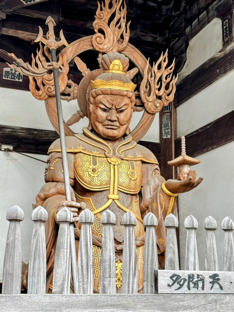 山門には多聞天と持国天が立つ。裏側には増長天と広目天もおり、特に広目天が渋くて印象的だった。