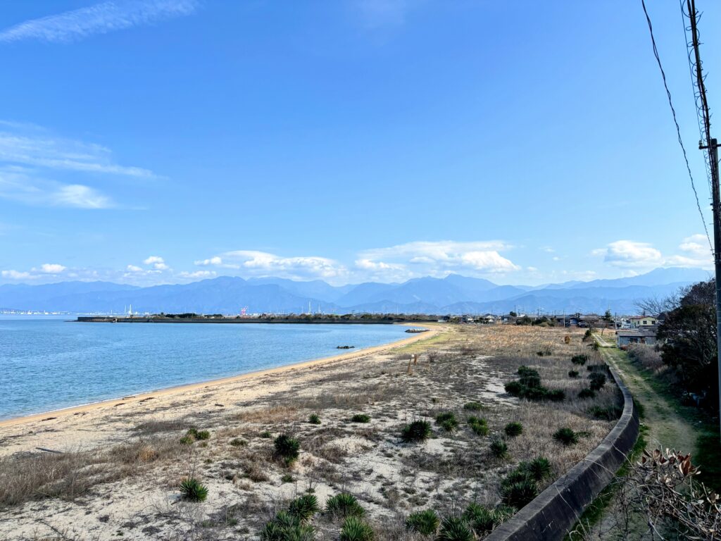 再び歩き出し、ふと海辺に出たところで石鎚山の方角が見えた。昨日の雨の影響か、山頂付近が白っぽく、雪が積もっているような感じがする。