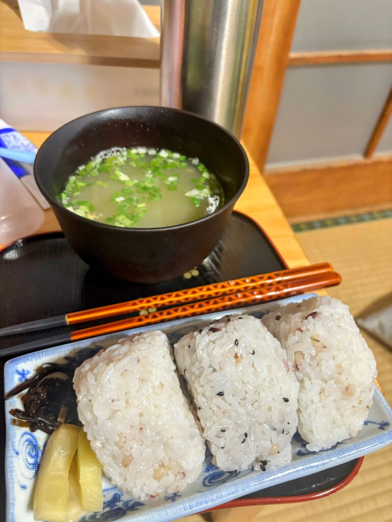 朝ご飯はおにぎりが用意されていた。昨日たくさんご飯を食べたのを見てくれていたのか、大きめのものを作っていただいており、大変ありがたかった。それを3つ食べて宿を出発した。