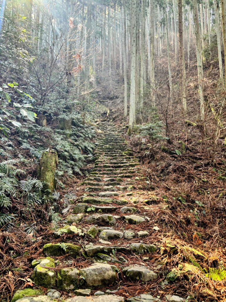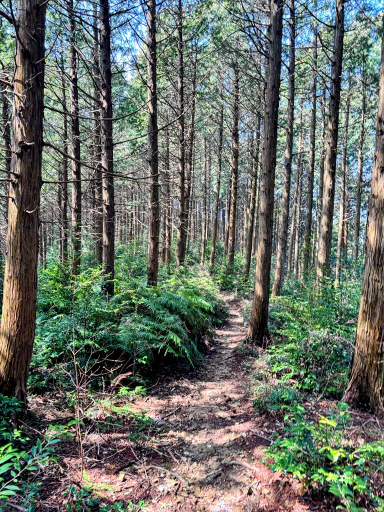 山道に入っていくところで、ほら貝を吹いている方に出会い、「健脚なら1時間、普通で1時間半で横峰寺に着くよ」と教えてもらった。歴史を感じさせる厳かな杉林の中を、汗を流しながらひたすら登っていく。