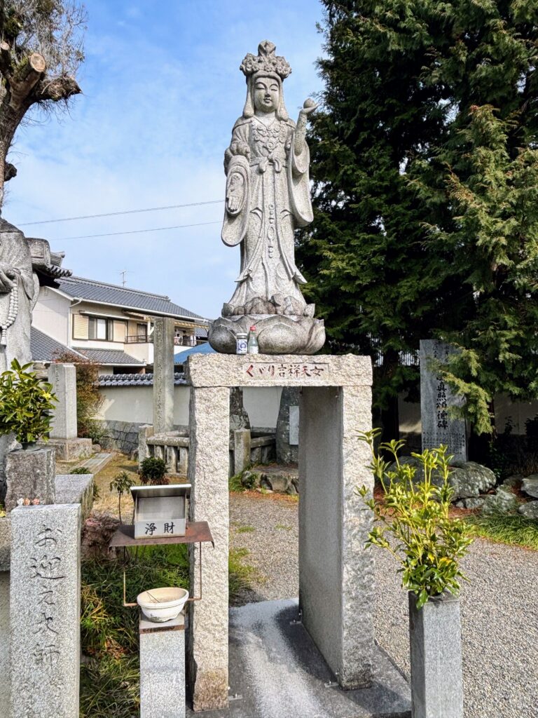 吉祥寺は、四国八十八ヶ所の中で唯一「毘沙門天(びしゃもんてん)」を本尊としている珍しいお寺だ。境内には「くぐり吉祥天女」という、くぐるとご利益があるとされる像や、目を閉じて金剛杖を通せば願いが叶うという「願い杖」などがあり、見どころが多かった。