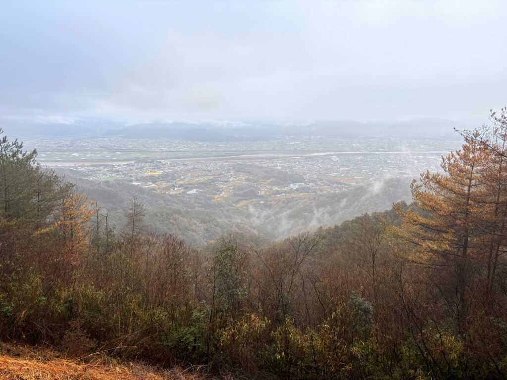 この少し先、登ったところに絶景ポイントがあった。昨日、雨の中を渡った吉野川と、広大な徳島平野が一望できる。