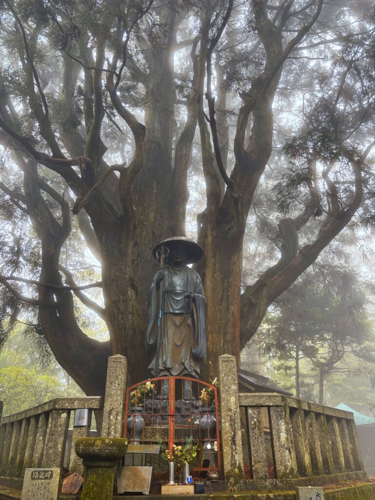 ここには弘法大師が休んだと言われる巨大な杉の木が、圧倒的な存在感で立っていた。その根本にある弘法大師像に手を合わせる。現在の標高は約760メートルだ。