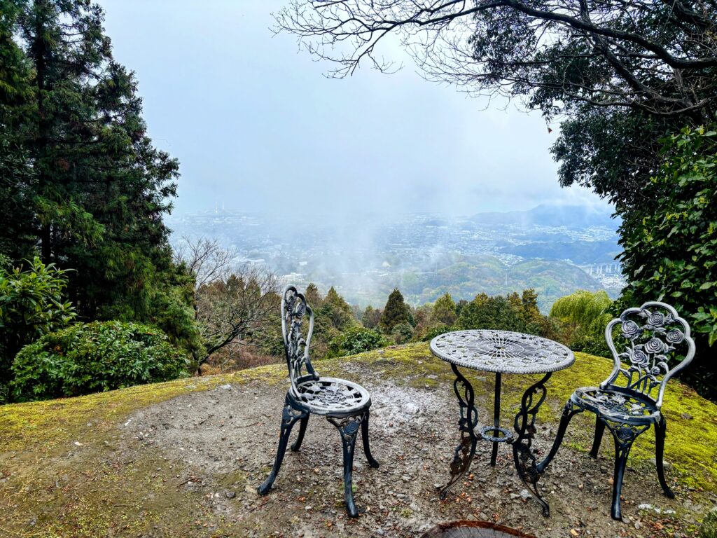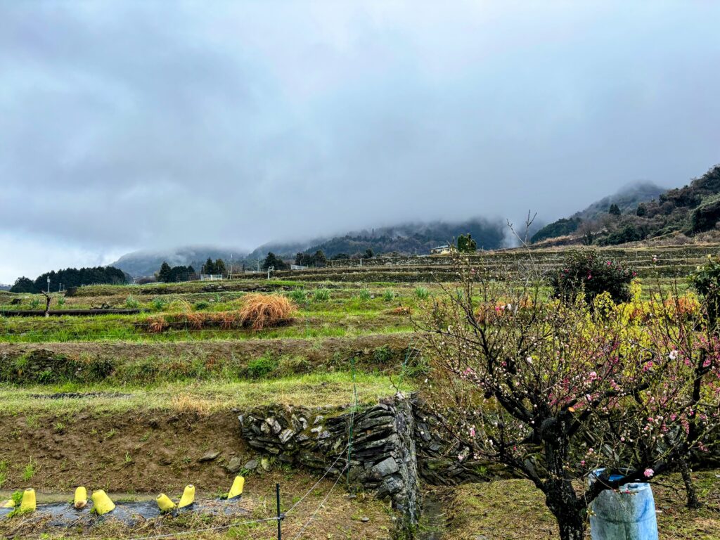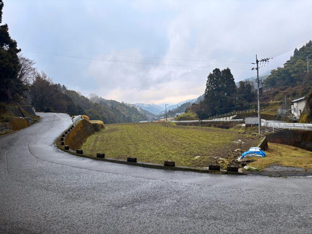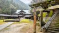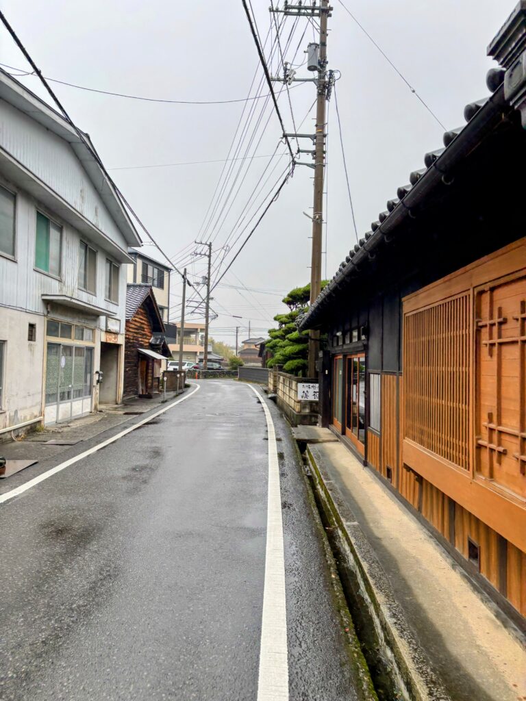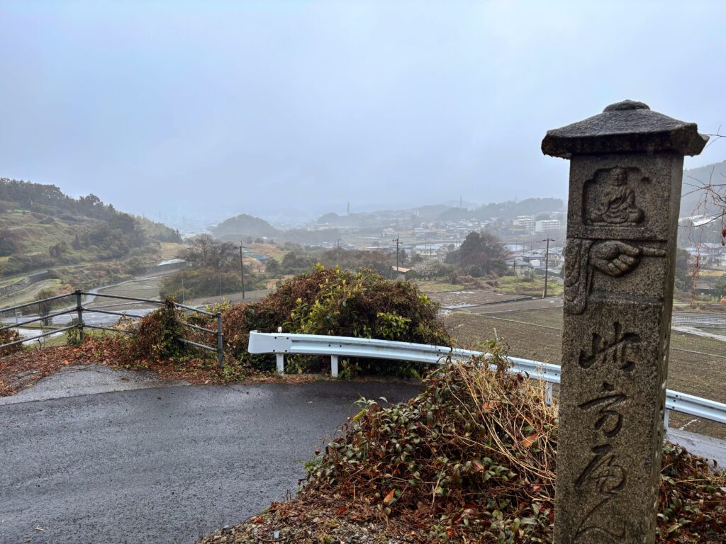 参拝を終え、舗装道路を下っていく。ふと平野の方を見渡せる場所に出た。遠く海のほうは雨が上がっているようだが、今いる山の中はまだ雨が降り続いている。山の奥まった静かな集落を抜けていく。