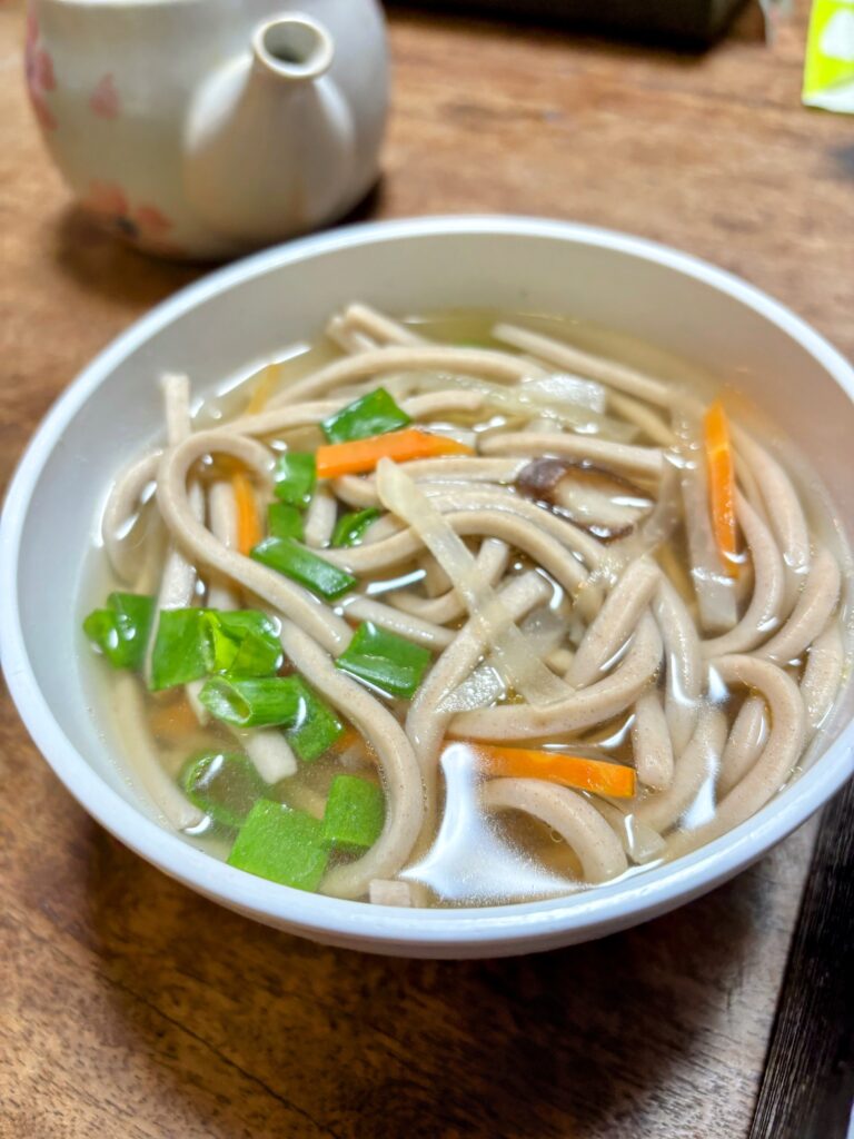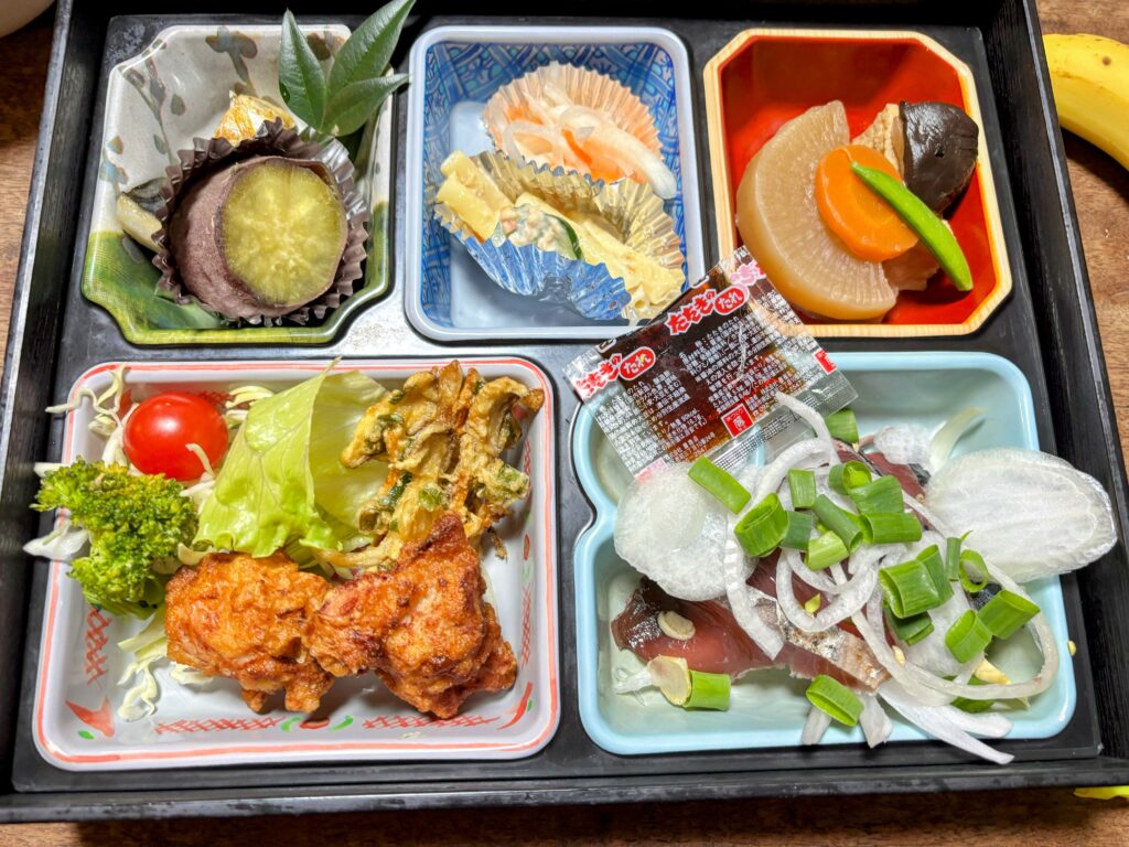 晩御飯は、四国の名産品がたくさん並ぶ手作り料理だった。鰹のタタキに鳥の唐揚げ、サバの塩焼き、そして庭で採れた野菜を使った煮物など、どれも疲れた体にしみわたる美味しさだ。さらに、祖谷地方が近いということで「祖谷蕎麦」も付いていた。うどんのように太い麺がとても特徴的だった。