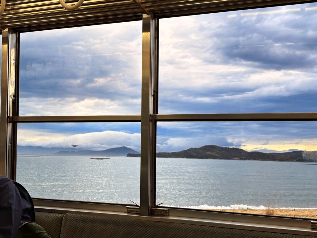 まずは宿を出発し、すぐ近くの琴電屋島駅から琴電に乗り込む。昨日登った屋島や八栗の山々、そして海沿いを走りながら電車は進んでいく。